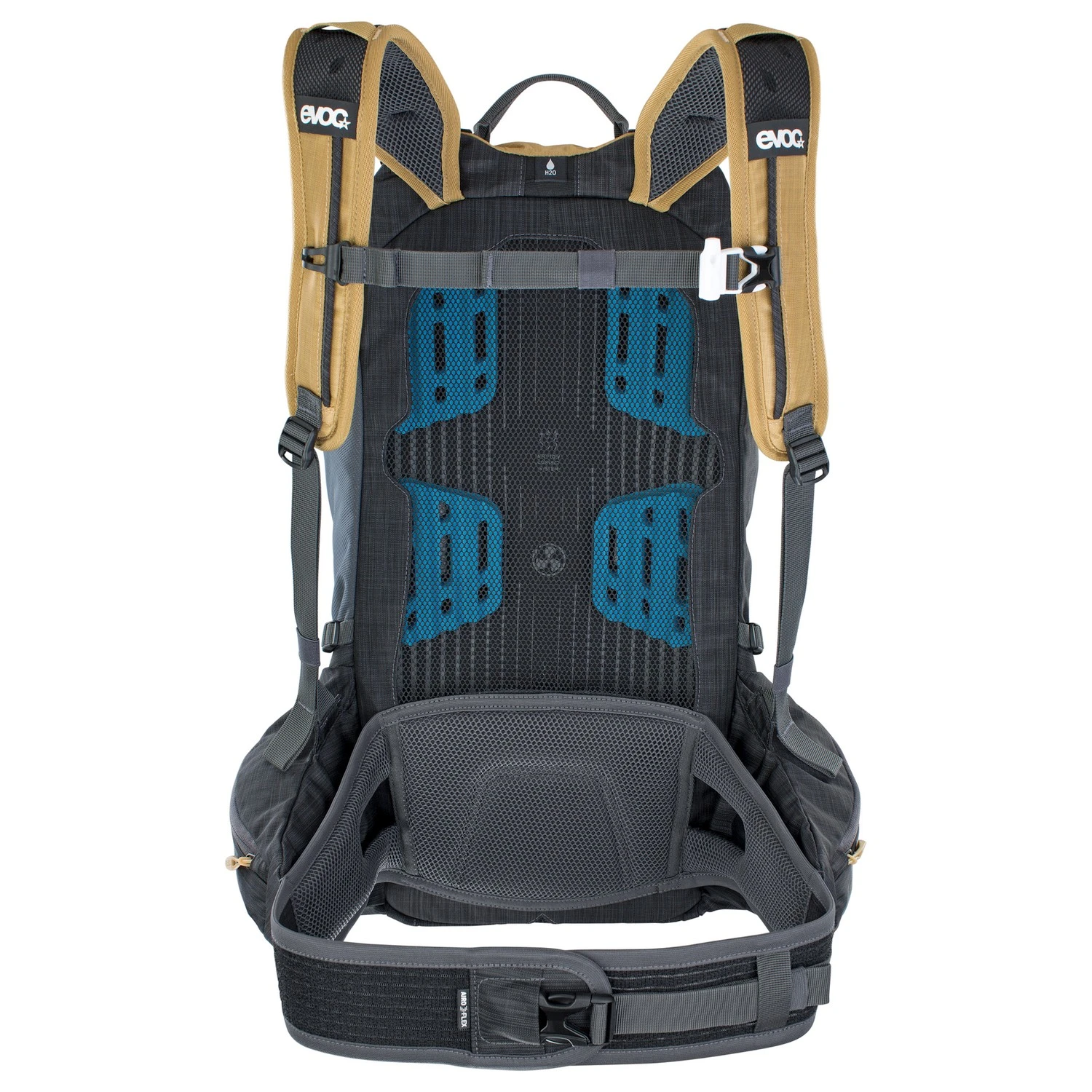 AIR FLOW CONTACT SYSTEM: Lasten werden möglichst neutral auf den Körperschwerpunkt umgelagert und gleichzeitig die Kontaktflächen zum Rücken minimiert. Dazu sind Belüftungskanäle und Pads nach innen hinter ein Mesh-Gewebe verlegt.